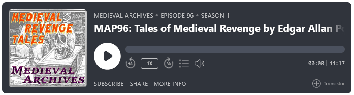 This isn't the first time Poe has made an appearance on Medieval Archive. I love Poe's work, one of my favorite stories is "The Tell-Tale Heart." It's not medieval but it is fantastic. On past Halloween episodes we featured The Masque of the Red Death and The Pit and the Pendulum.